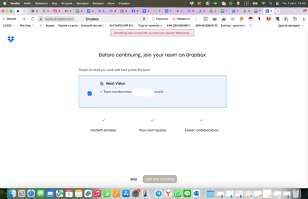 Device (Macbook PRO M4) Operating System/Browser (if using the web) (Sequoia 15.2) Question or Issue Hi. Dear Dropbox support team. I posted this message 4 hours ago in search for a help but a post was deleted for no reason. Why? My problem is - I registered in Dropbox with my corporate account using my company’s domain name. Then I received an email invitation from colleagues to join the company team. However, when I try to join, I see an error message and cannot proceed. Why is this happening and what should I do? My plan is still free, and I cannot upload files to the corporate folder. Wondering why. Please help.72Views1like1CommentI had linked my Apple ID to a now deleted Dropbox account and I can't use it to create a new one.