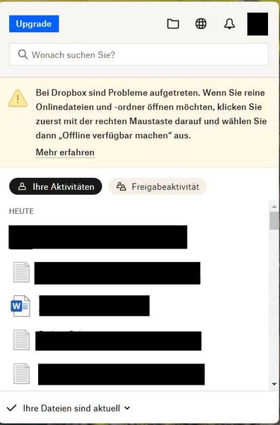 Guten Tag, ich hatte bei meinem Notebook eine kurze Zeit keine Wlan-Verbindung und in der Zeit wollte ich gerade eine Datei öffnen die bei Dropbox nur online zur Verfügung stand. Die Wlan-Verbindung stand dann nach kurzer Zeit wieder zur Verfügung und es funktioniert auch alles normal mit Dropbox. Die nervig große Fehlermeldung im Dropbox Programm (siehe Screenshot) ist aber leider geblieben. Wie kann ich die Fehlermeldung nun deaktivieren oder ausblenden? Denn das Problem ist ja schon lange gelöst. Daten: Windows 11 Pro 24H2, Dropbox Programm ver. 213.4.4597181Views0likes2CommentsFehlermeldung beim Öffnen von Dateien
