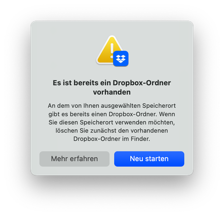 Hallo, so eben ist meine wichtigste Dropbox aus der Seitenleiste verschwunden. In der Web Version sehe ich alle Ordner, aber eben nicht mehr in der Seitenleiste. Zuvor habe ich eine seltsame Fehlermeldung erhalten: " Dropbox-Ordner fehlt Ihr Dropbox-Ordner wurde von seinem ursprünglichen Speicherort verschoben oder gelöscht. Dropbox wird erst wieder ordnungsgemäß funktionieren, wenn Sie den Ordner wieder an den früheren Speicherort verschieben. Hier befand sich der Ordner ursprünglich: /Users/ [removed]/Dropbox (Privat) Jm ihn zurückzuverschieben, klicken Sie unten auf „Beenden", verschieben den Dropbox-Ordner zurück an seinen ursprünglichen Standort und starten Sie Dropbox erneut. Dieser Computer war zuvor mit dem Dropbox-Konto von [removed] verknüpft. Wenn Sie ein Konto erneut verknüpfen möchten, um Ihre Dropbox aus der Webversion herunterzuladen und wiederherzustellen, klicken Sie auf „Erneut verknüpfen"." Ich habe einer erneuten Verknüpfung zugestimmt. Das hat aber nicht geholfen. Die Fehlermeldung tauchte innerhalb von Sekunden wieder auf. Danach war die Dropbox einfach weg. Kann mir jemand erklären, was da passiert ist und wie dich die Dropbox wieder installiere ohne versehentlich alle Ordner zu löschen? Herzlichen Dank [personal information removed per the Dropbox Community Guidelines]47Views0likes2CommentsFehler: Es ist bereits ein Dropbox-Ordner vorhanden