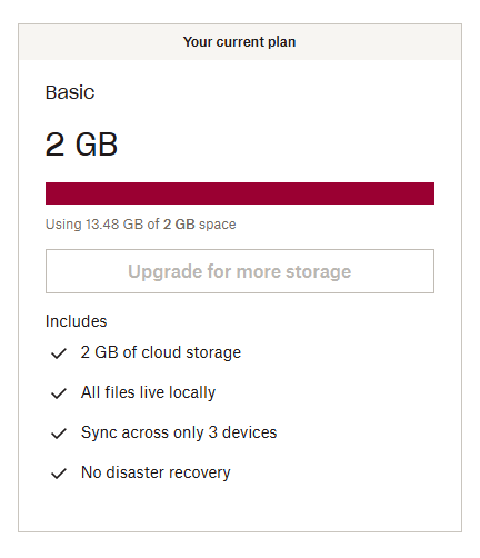 Hi, Is everyone on a free subscription hassled to upgrade to a much bigger (and obviously, paid) account even when they're barely using it? I have just 3.1GB of 100GB storage in use and yet I've just received an email warning me thus "Your Dropbox is almost full and is close to reaching maximum storage capacity. Once full, your files will stop syncing across devices, which will make it harder to access your files when you need them." In addition, I can't find any way to assess how much storage I am actually using other than to select everything and then download it in a zip file. The zip file was 3.1 GB so it may well be that the actual storage being used is more, but almost 100GB? No way. Curious about the experience of others. Cheers, KevinSolved3.7KViews2likes14Comments