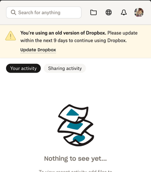 Application Affected Dropbox for Windows Device Desktop Operating System/Browser (if using the web) Win11 Dropbox App Version (if using the app)Latest Question or Issue Every single day, the Dropbox app has started popping up a notification that my Dropbox is full and wants me to upgrade. I am well aware that my Dropbox is full, and I have no intention of ever upgrading. Please make this popup stop.92Views0likes6CommentsI'm being asked to update my desktop app to the latest version, but the update fails.