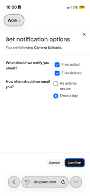 I use the Camera Uploads feature on an iPhone SE, and then access the photos to list items on eBay, so I delete the photos after theyâre used. I wanted to track how many photos were added and removed if possible, which the Follow feature looks like it should do, except I enabled it on my Camera Uploads folder 2 days ago and have not received any daily updates. I think I have it set correctly, and I receive other emails from Dropbox, so I donât think thatâs where the issue lies. Does that folder maybe not support the Follow feature even though itâs shown as an option?SolvedI got a popup on my device asking me to upgrade, even though notifications are off.