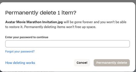 I was surprised to find that the Photos tab in Dropbox online (i.e. at Dropbox.com) contains bookoo pics from wayyyy back. I've always deleted pics from the iPhone after naming and saving the ones I want to keep on my PC (in Dropbox folders of my own (conscious) creation). In Dropbox it says, "Camera uploads is turned off." Don't believe I've ever intentionally told Dropbox to save all photos.29Views0likes2CommentsTrying to delete a file permanently but being asked for a password