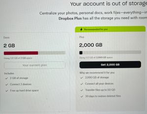 Dropbox Plan Standard Device Desktop/iphone Operating System/Browser (if using the web) Windows 11 Question or Issue I was a very early adopter and recommended Dropbox to many others, earning the maximum (I believe) storage space through my efforts. I have a number of not-for-profit files on the system, which are now under threat because Dropbox is now saying I only have a 2GB allowance. This came about after I uploaded some files on a temporary basis and hit my maximum storage space. This was quickly addressed, but I seem to have lost the space that I previously enjoyed, having earned it via referrals. I need to know whether or not it is recoverable, as I will have to make other arrangements for my not-for-profit activities if it isn't recoverable.228Views0likes13CommentsDropbox mails says I'm out of space, but I'm using only 17%.