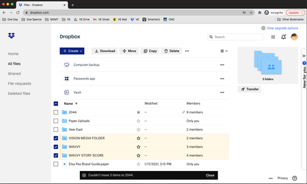 Hello, I have recently upgraded my Dropbox in an attempt to keep my folders organised. I am trying to move "Wavvy", "Vision Media Folder" and "Wavvy Story Score" into the folder "2044", but for whatever reason I keep receving the message "Couldn't Move 1 Item". The same is happening regardless of whether I use an incognito. I have attached a screen shot. Thank you in advance for your assistance. Warm regards, ElsaSolved4.7KViews1like4Comments