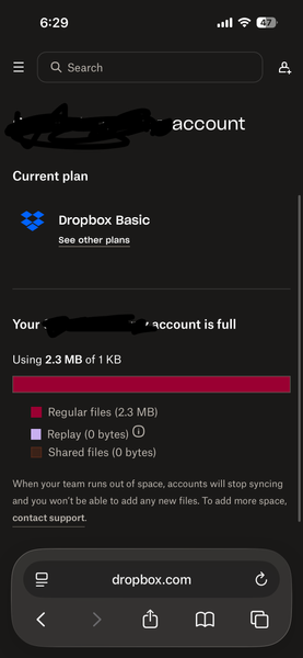 Dropbox Plan Professional Device M1 iMac Operating System/Browser (if using the web) MacOS Tahoe Dropbox App Version (if using the app) 238.4.6305 Question or Issue My Deskto App is showing that I'm using 4 TB of 4 TB. My online account shows that I'm using 2.76 TB of 4 TB. The online info is correct. The info from the desktop is wrong. I am getting Low Disk Space messages and my files aren't syncing and I think it's because the desktop app thinks I have no space available. Any idea how I can fix this? Thanks67Views0likes6CommentsGetting a message that my account is full when I'm only using about 700 MB