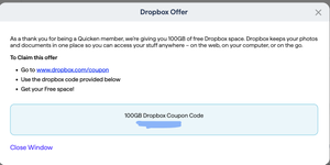 Dropbox Plan Free to Plus Device HP Laptop Operating System/Browser (if using the web) Win 10 Question or Issue: I upgraded from Free to PLus for more storage however, Dropbox on the computer still shows "out of space" error when I try to move files over to Dropbox. Do I need to update the computer side or what?74Views0likes2CommentsQuicken coupon for 100GB added space doesn't work.