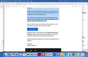 Hello, I am trying to configure the 2FA using the Yubico authenticator. At the end of the config, it seems to accept the 6 digits code. I log off, to test, but when it asked me the code, it do not accept it. As config on the Yubico, I am using: base on time, SHA-1, 30s and 6 digits Any ideas ?75Views0likes4CommentsIs an email I received about a Dropbox research study ($100 gift card) legit or a scam?