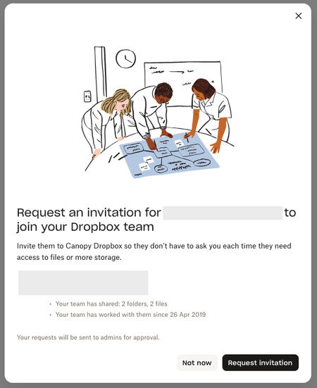 how do I get rid of this frustrating pop up when sharing a link with a client? We're a paid dropbox business member and I get a tonne of clients telling me they cant access the files because of this popup. Needs to able to be switch this off. I pay to have ability to share files externally so either make it free and keep the pop up, or let me turn it off. Thanks, so this thread, but not locked - https://www.dropboxforum.com/discussions/101001014/remove-loginsignup-dialog-box-from-shared-link-download/757059#M82871452Views8likes9CommentsDropbox Business: Disable "Request an invitation" popup for users after sharing