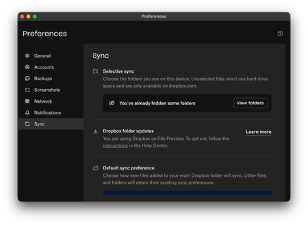 Application Affected Dropbox Device Mac Studio Operating System/Browser (if using the web) macOS 26.2 (25C56) Dropbox App Version (if using the app)241.4.4795 Question or Issue Setting up a new Mac. I've a Dropbox with a few 100 GBs worth of stuff, I want 99% available offline at all times (not short of storage on the new Mac). Selective sync set up to exclude a few folders. Using Dropbox on File Provider. Default sync behaviour is "available offline". However things are NOT synced to be available offline. I've gone to ~/Library/CloudStorage, right clicked the Dropbox and said "Make Available Offline". But I now have a weird hybrid of the green "available offline" Dropbox logo but also the cloud macOS icon saying it needs to be downloaded! I've tried downloading en masse but no option to do that. There must be a way of resolving this? Thanks!Solved37Views0likes8CommentsSyncing icons are missing on Mac OS
