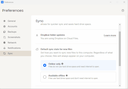 I am unable to select "Available offline" as the "Default sync state for new files" within the desktop application Preferences. I do have the ability through the "right click" menu to "Make available offline" or "Make available online-only" This was working in previous versions. I only noticed recently because someone shared a folder with me and it was not immediately available offline. Device Desktop Operating System/Browser (if using the web) Windows 11 Pro 24H2 Dropbox App Version (if using the app) 228.4.5567 Dropbox Plan Family410Views0likes9CommentsNo option for "make online only" when I right click my files