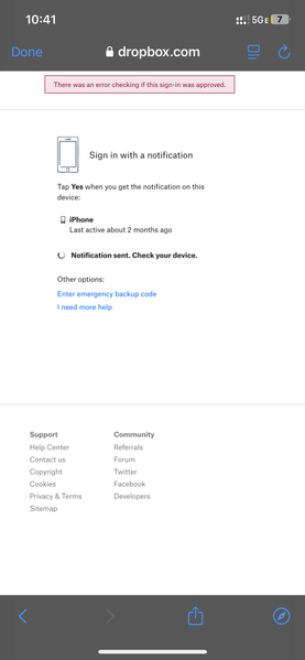 My iphone was stolen, and two factor authentication is stopping me from logging in. A code is supposed to be sent to my new phone, but I never receive it. Sometimes I receive an error message that says there was an error sending the code. I changed my password on my account with the Apple Private Relay address, but I am not receiving the code, so I canât logon. I have 2 factor authentication on, and I canât get the code from the Auth App either because of the stolen phone. See attached screenshot with error message Dropbox Support staff says I will never be able to recover my account because the email address is an Apple private relay address and I cannot send them an email from this address. This is ridiculous. I have recovered other accounts elsewhere that use Appleâs private relay address. Dropbox Support says they are going to just close my Help Desk Ticket without helping me further/with no resolution. This seems to be bad security recovery design. I would appreciate any help in gaining access to my account. I only have one device- my new iPhone. Thanks1.6KViews0likes8CommentsI can't log in to Dropbox 'Two-step verification text message can't be sent'