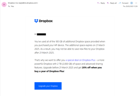 I received an email from Dropbox this morning that basically contains lies. Now I know misinformation is becoming the norm over the pond, but I'd like to think that here in the UK we can keep a reasonable amount of truth in our communications. The email (below) claims I have used all of the free 100GB Dropbox allocated me when I purchased an HP laptop. However, a simple look at my quota used shows that not to be the case. I'd like to think that this is some form of "mistake", but I feel it is a cynical attempt to get those who are not IT savvy to worry they are about to lose information and subscribe to an upgrade they do not need. Anyone else getting these lies sent them??Solved105Views0likes2CommentsIf I upgrade but someone else doesn't can they still access shared folders?